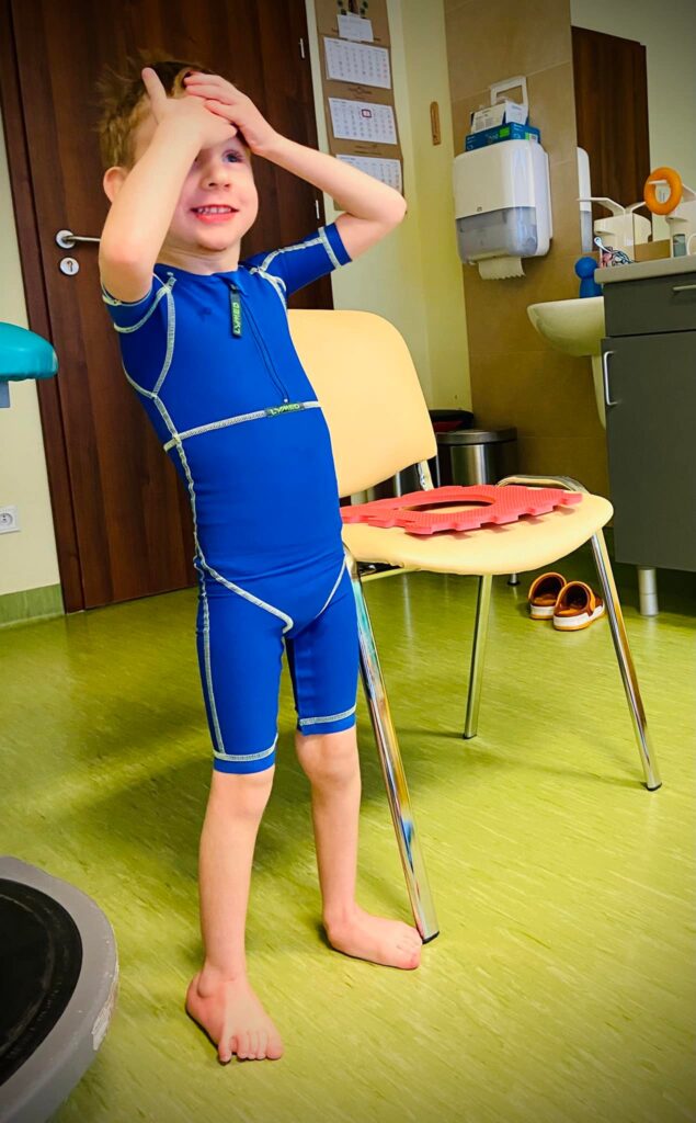 Orteza kompresyjna (odzież medyczna) ma na celu zwiększanie stabilności fizycznej i kontroli posturalnej u dzieci takich jak ja – z zaburzeniami motorycznymi. Działa też na wzrost świadomość ciała u dzieci z zaburzeniami funkcji sensorycznych, czyli u mnie ????